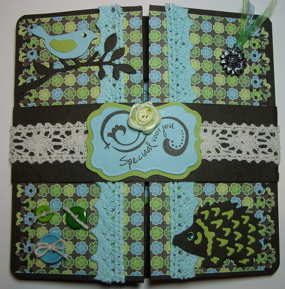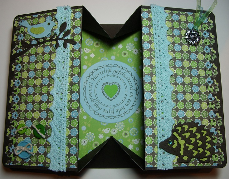 Verder nog lint, bloem bedeltje en 3 knoopjes gebruikt. Ook Joy mal egel en MD mal vogel op tak gebruikt.