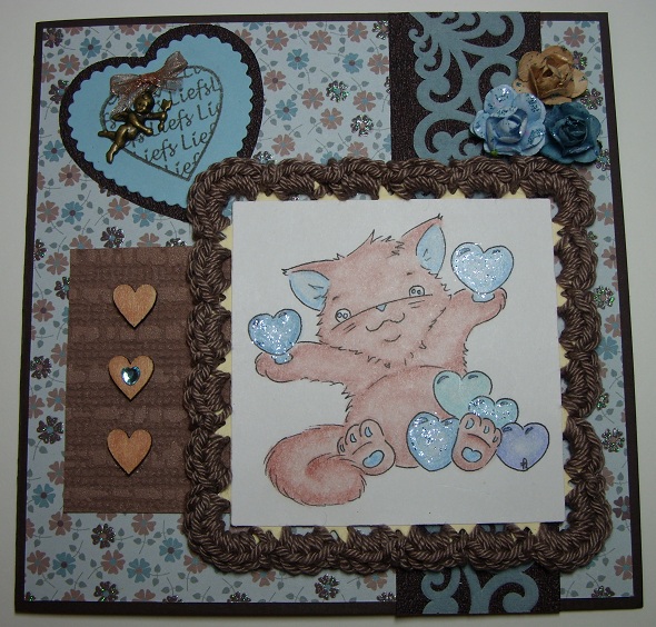 Papier komt van Boekenvoordeel, een borduurmal van Joy gebruikt, een 3d plaatje van een snoesje, houten vlinders komen van de xenos.