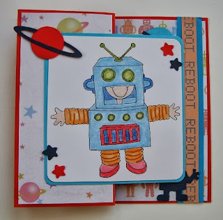 Een kaart gemaakt met een digi van Dearie Dolls digi's met dit jongentje verkleed als ruimtemannentje.
