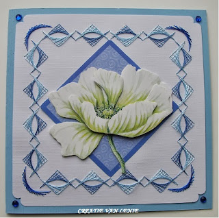 Zo een borduurkaart in de kleuren blauw gemaakt. Dit met een 3d plaatje van Janneke Brinkman.