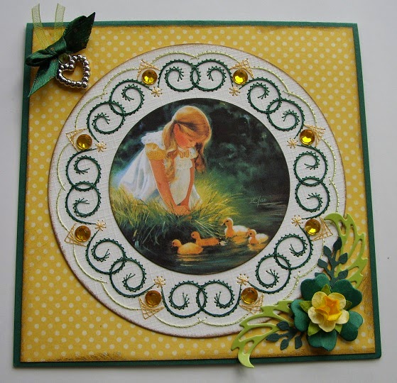 Een kaart gemaakt met de borduurmal van Joy met dit schattige plaatje van dit meisje met die kleine eendjes.