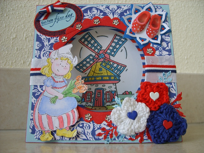 Het venster heb ik gemaakt met Xcut mallen en daar een digistempel van een molen in gemaakt van een kleurplaat.