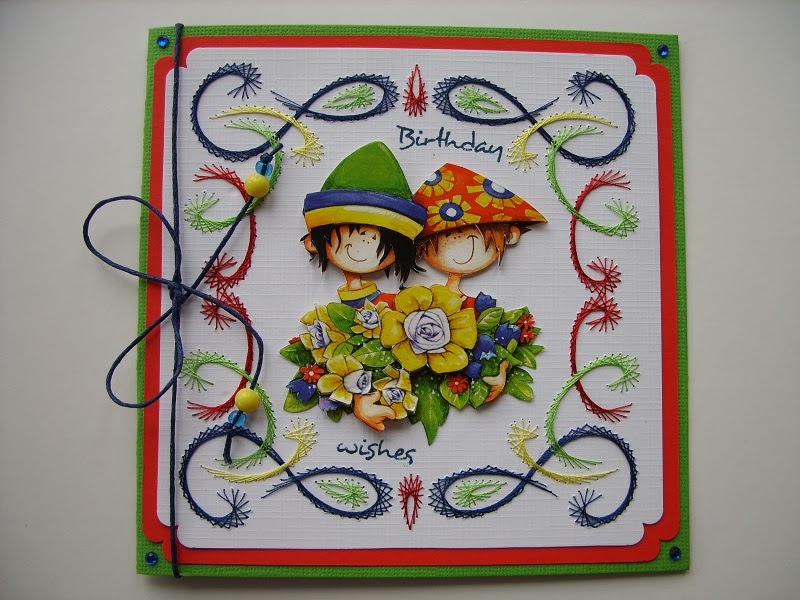 Kaart gemaakt met patroon van Sjaak van Went uit Hobbydols 73 met een schattig plaatje van snoesjes.