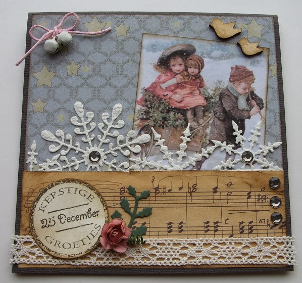 Papier en de al oudere 3d plaatjes passen erg mooi bij elkaar, verder nog sneeuwballen, sterren,belletjes en sneeuw gebruikt.