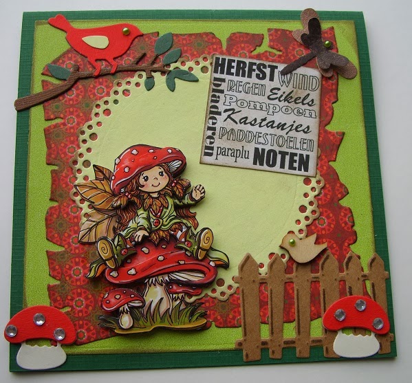 Wat een alleraardigst tafereeltje is dit kaartje Lenie....op een grote paddenstoel...wie kent het niet! Erg mooi gemaakt!